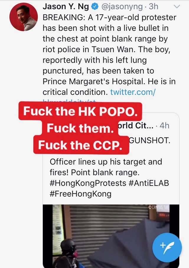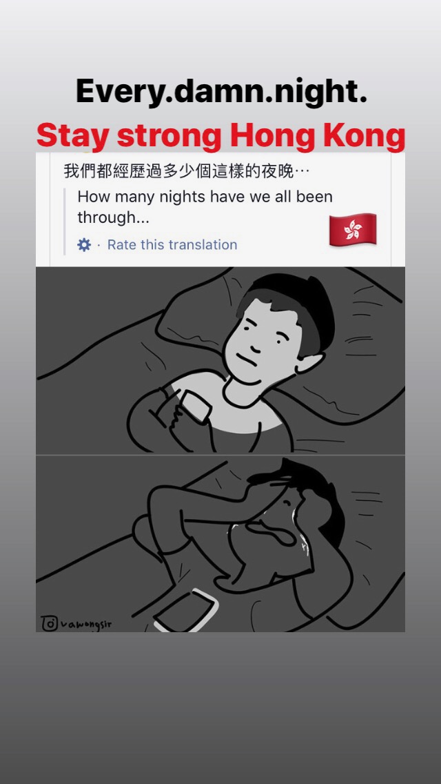 ‘Shit. Just listening to ‘Lost’ – it brings me back to early October. The dark streets in Price Edward. Graffiti – broken traffic lights – smashed banks – the MTR on fire, water dripping, running down the stairs – left to burn, left to flow. People out on the streets, some aimlessly, some with purpose. Most of us there because we wanted changed. We were there for democracy, justice to be served against the violent, brutal police.