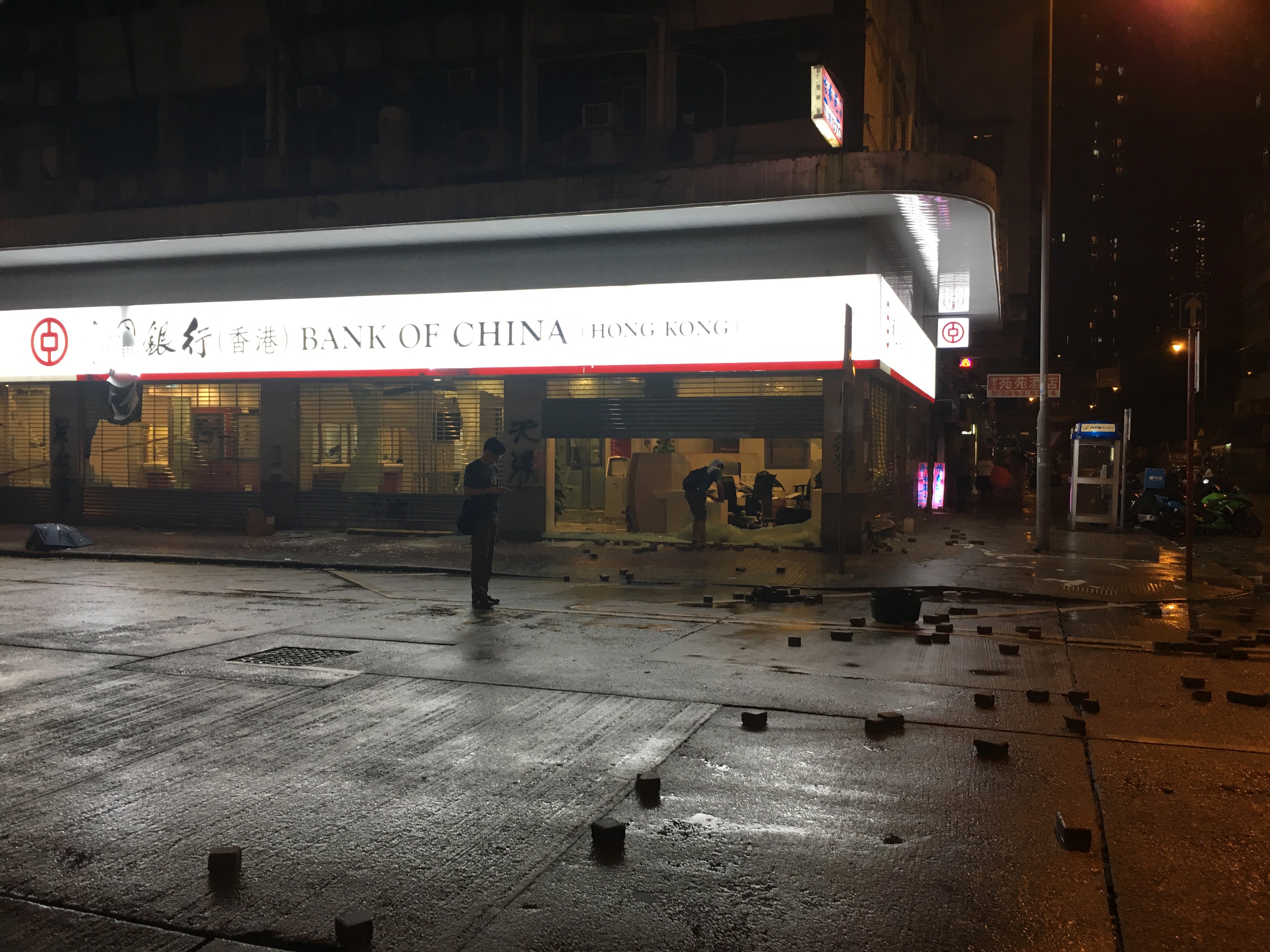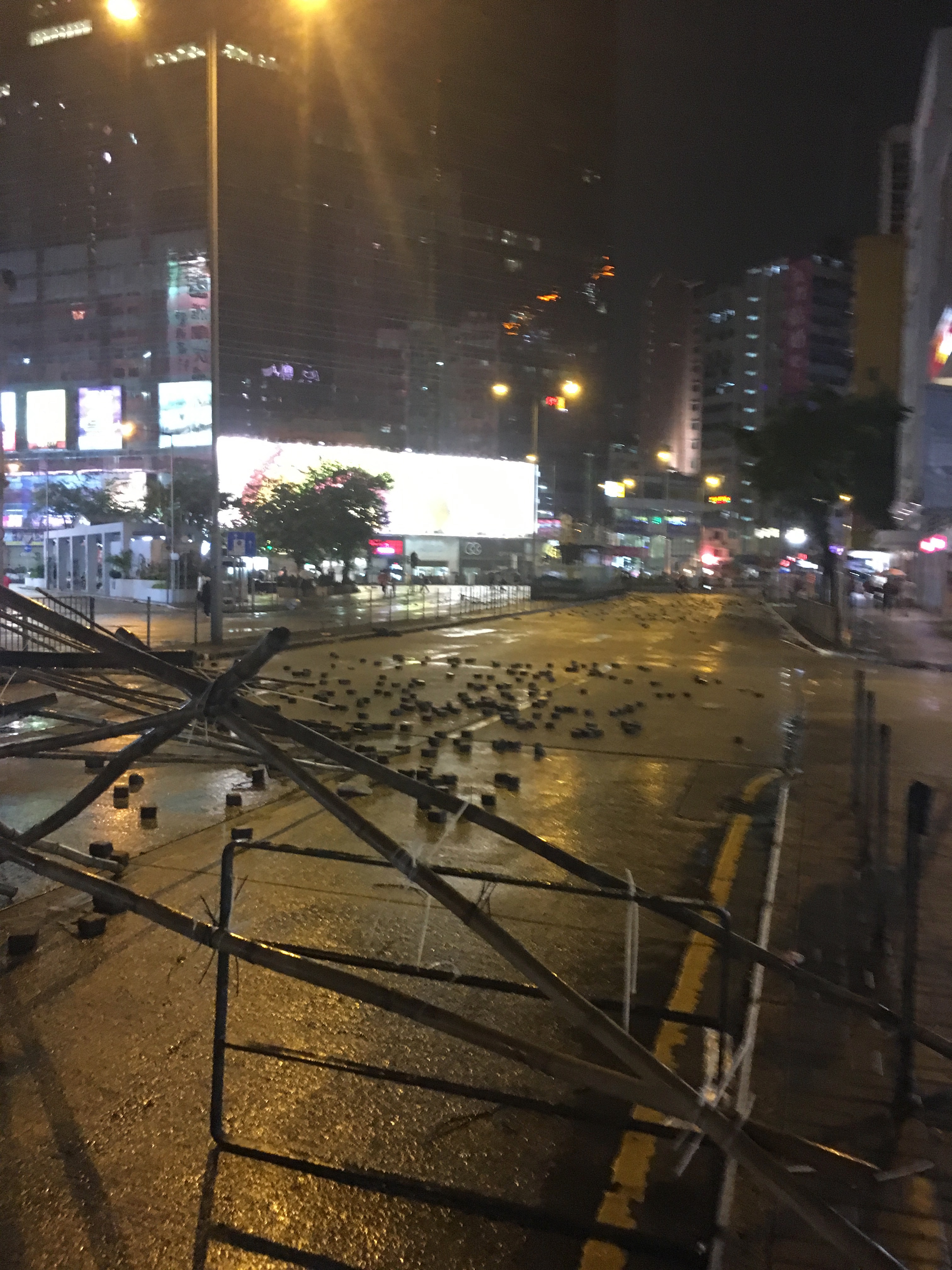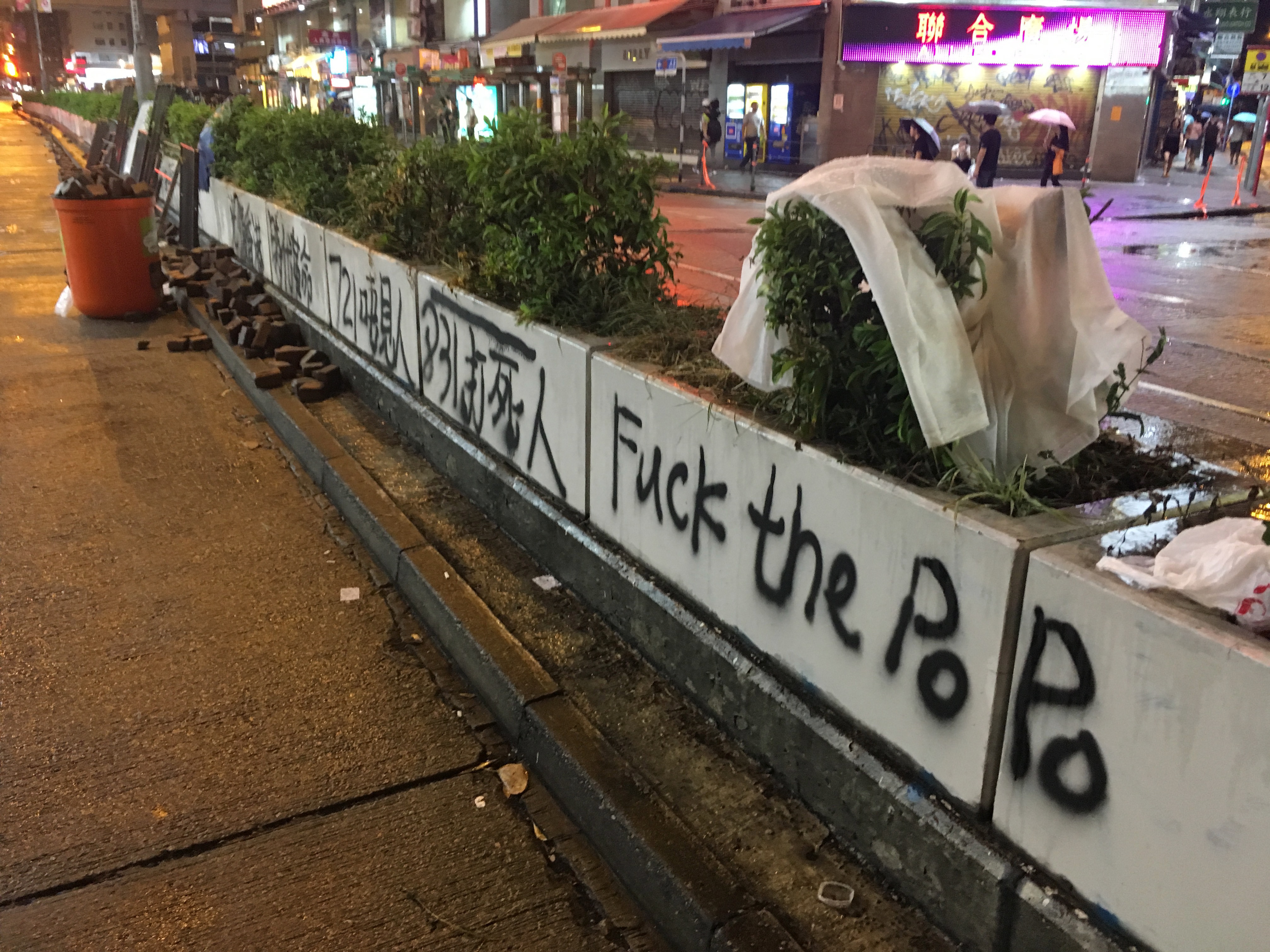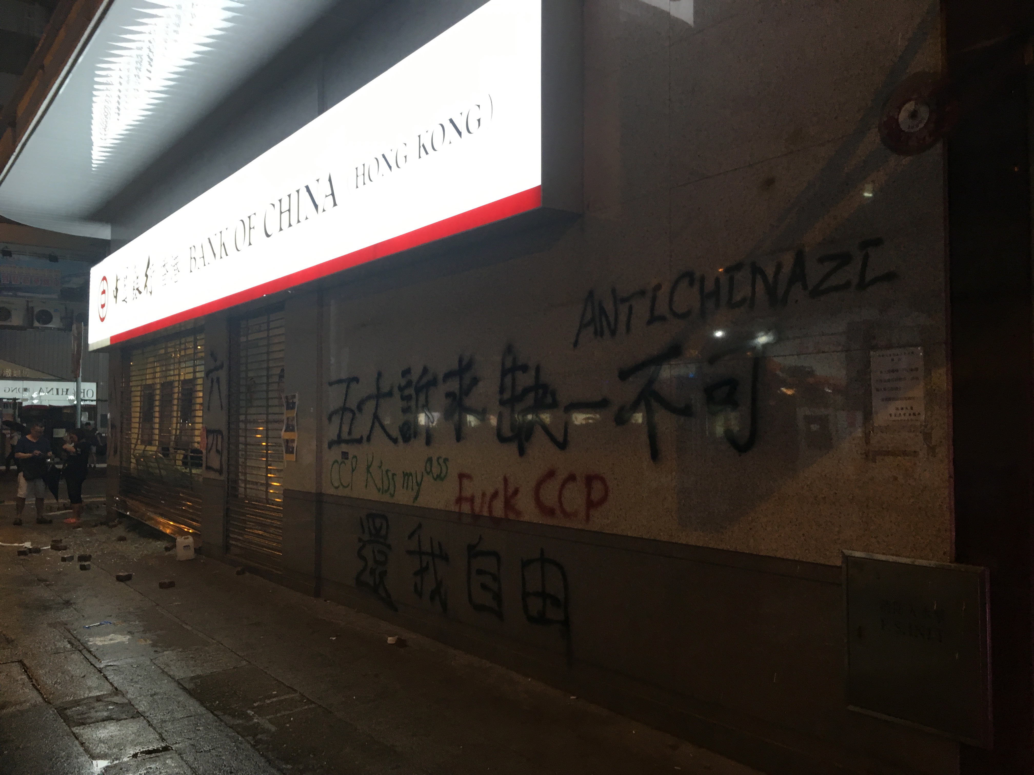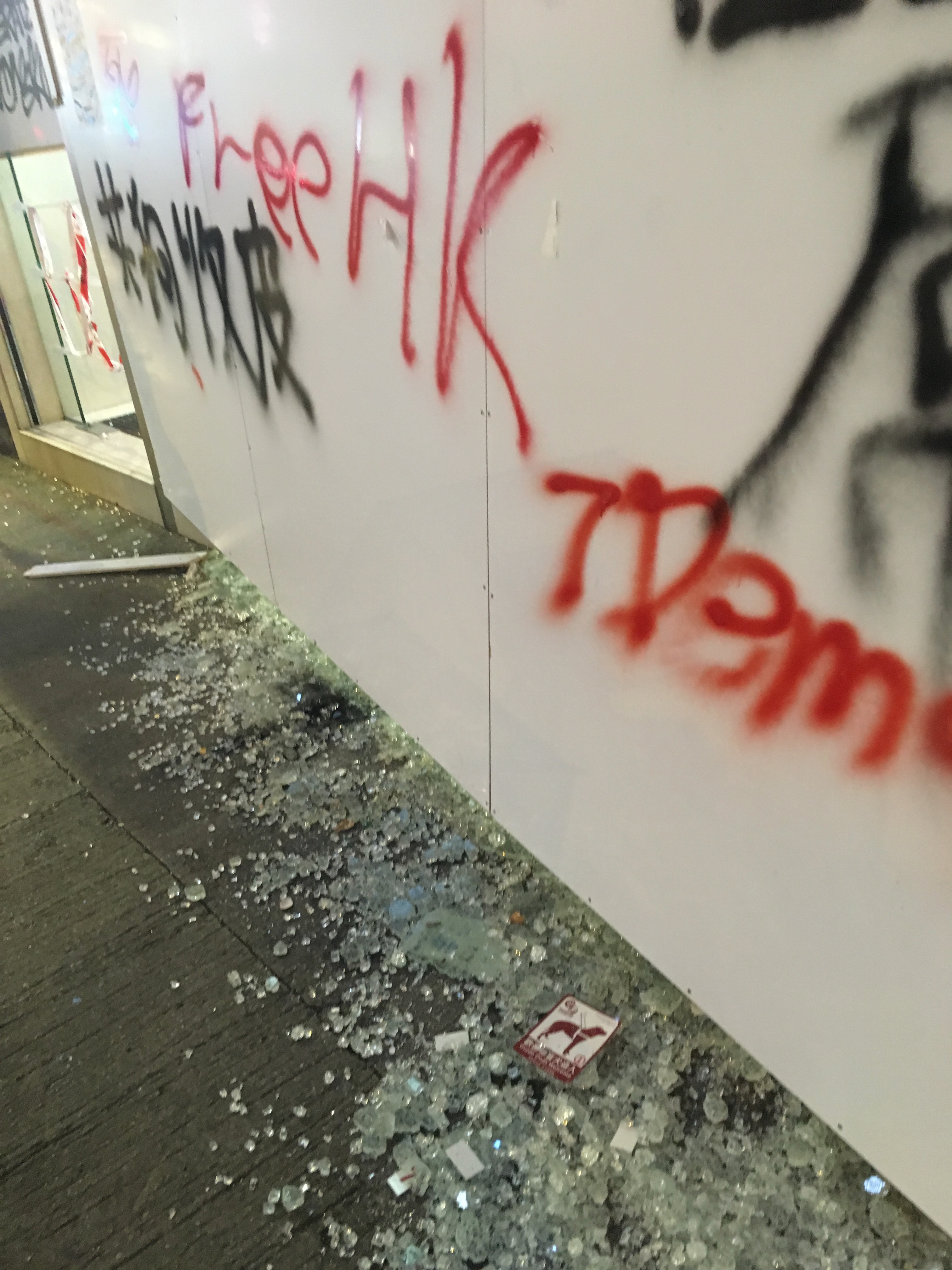 After dropping my bags off, I headed out to walk around, to be with people, to protest, to see what was happening, what had happened. I didn’t care about the property destruction. People are worth more than property. But it hurt seeing the destruction, not because I cared about the property or the companies, but it hurt seeing my city broken. I welled up reading the graffiti. I stared at the bricks all over the roads, looking like art installations. Barricades made of bamboo and of mental railings.
