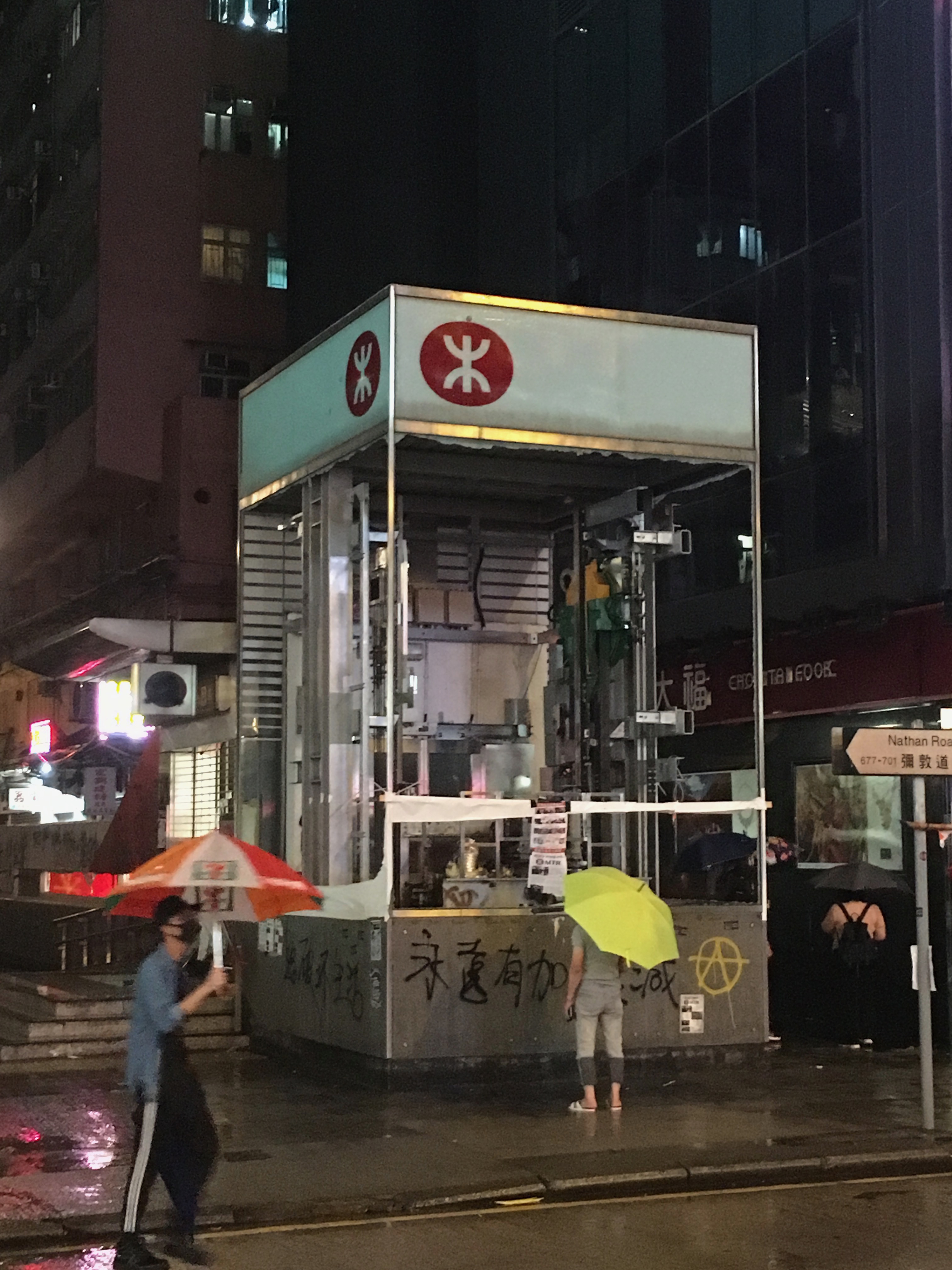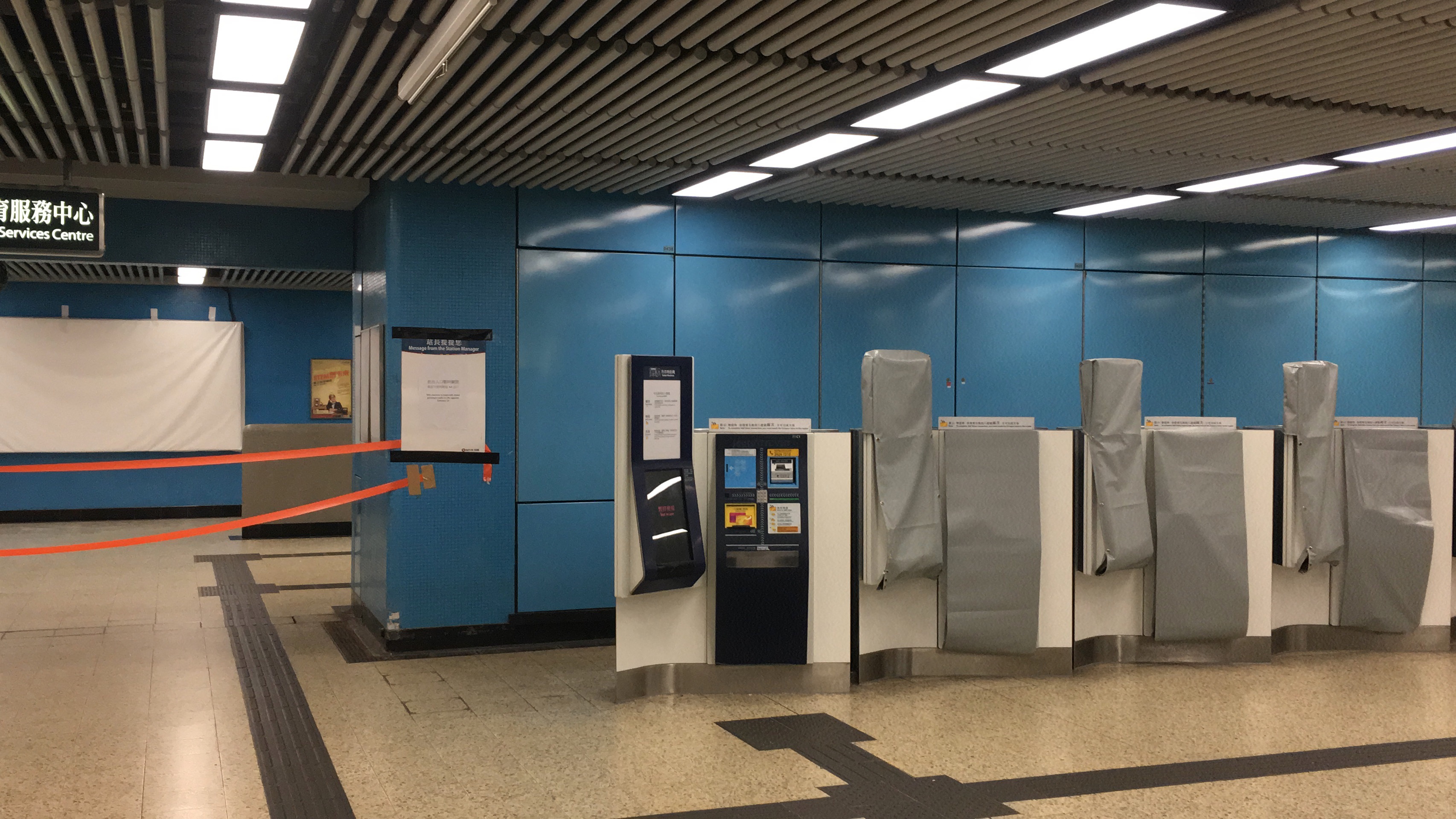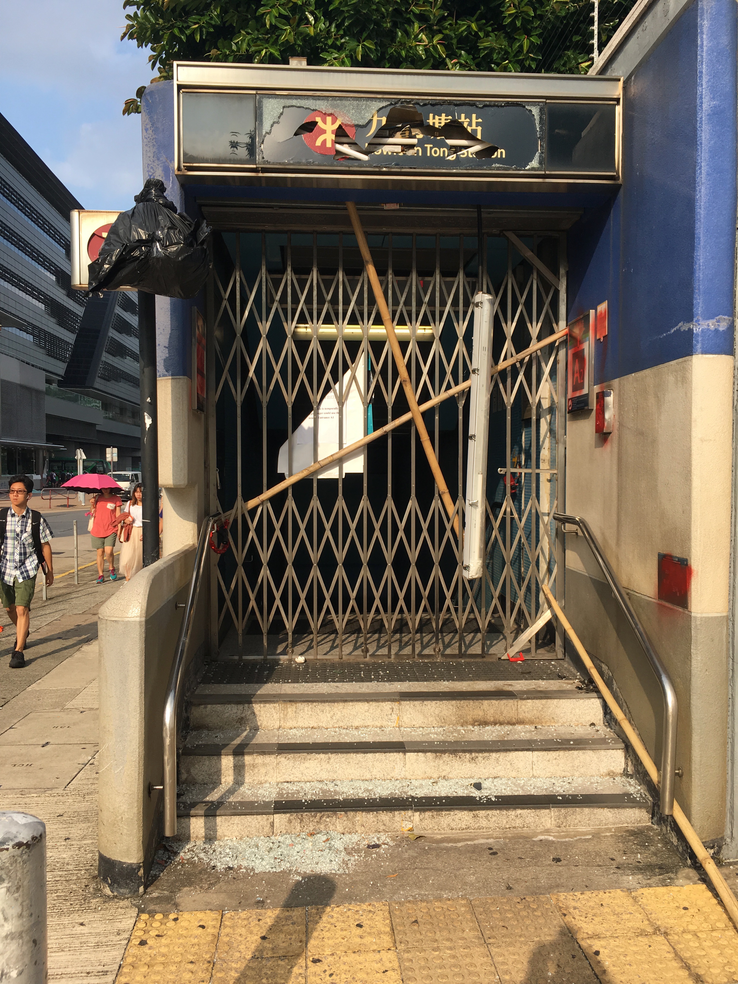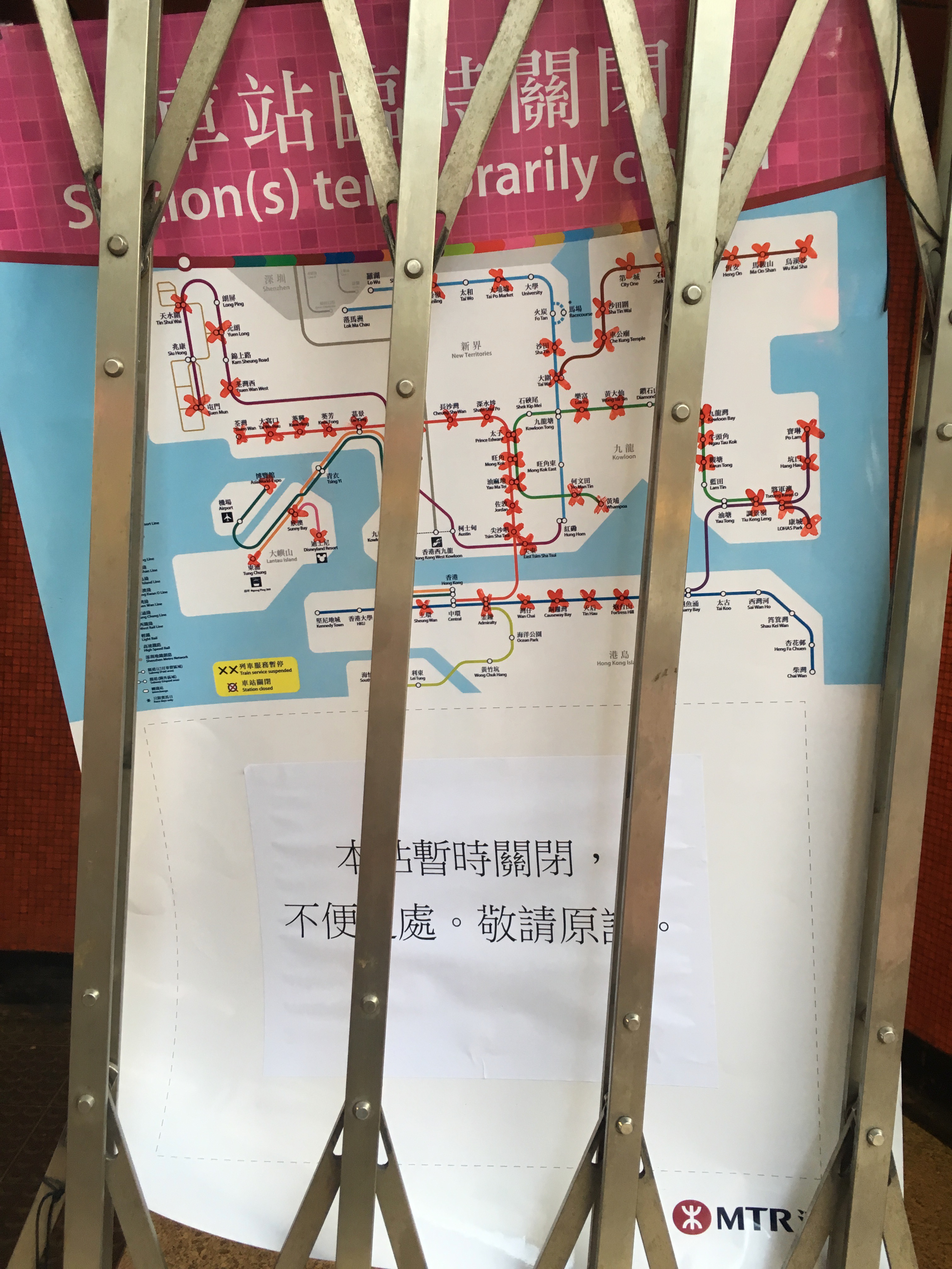 Just to note Kowloon Tong Station. It was normal now that at many stations exits were shut, and many machines covered up due to ‘ not working – vandalism.’ It was found out, that a lot of this was bullshit – by people actually trying the machines, and being able to use them, and seeing they clearly weren’t damaged underneath the fabric. Clearly this exit was damaged though!