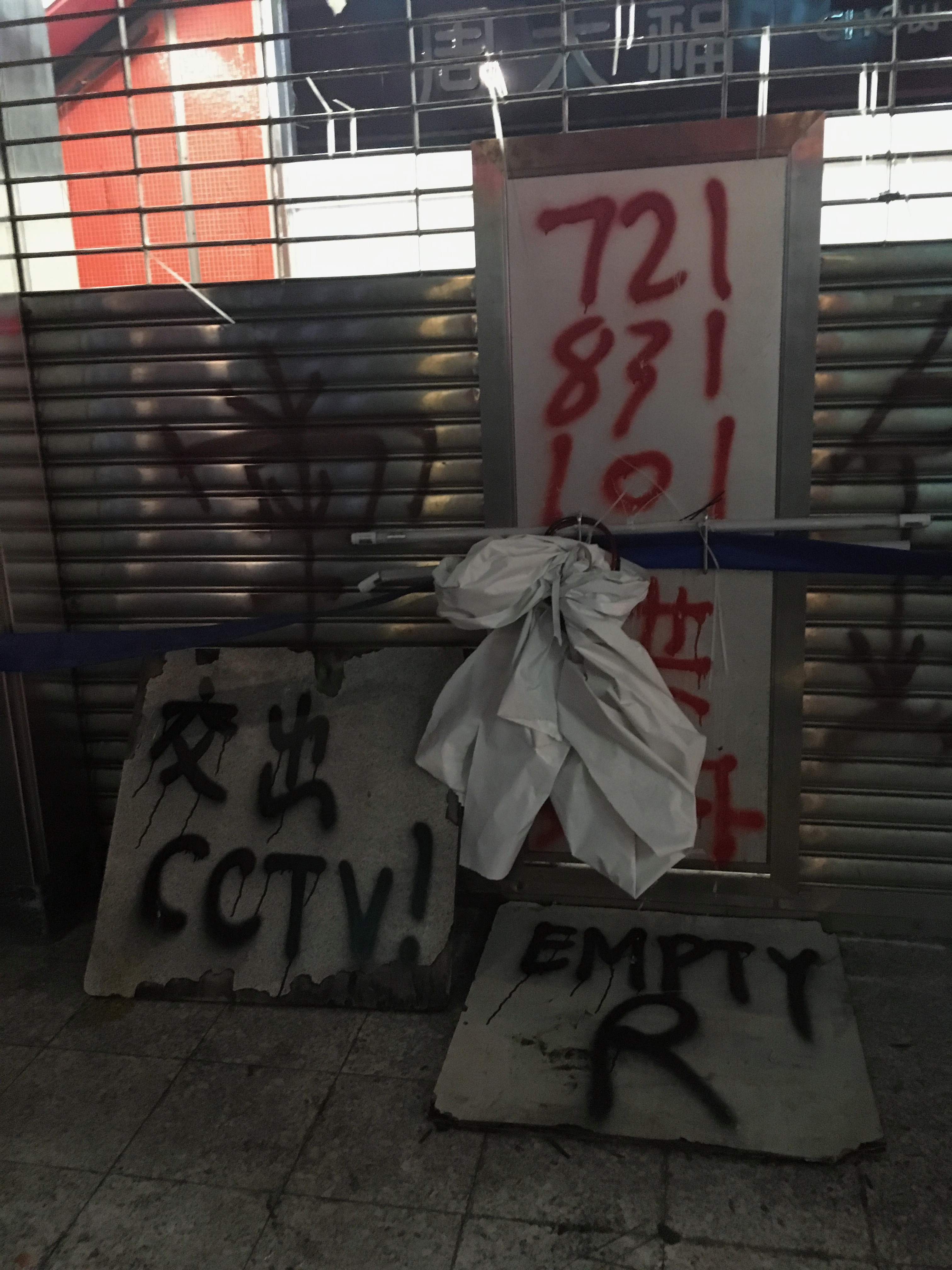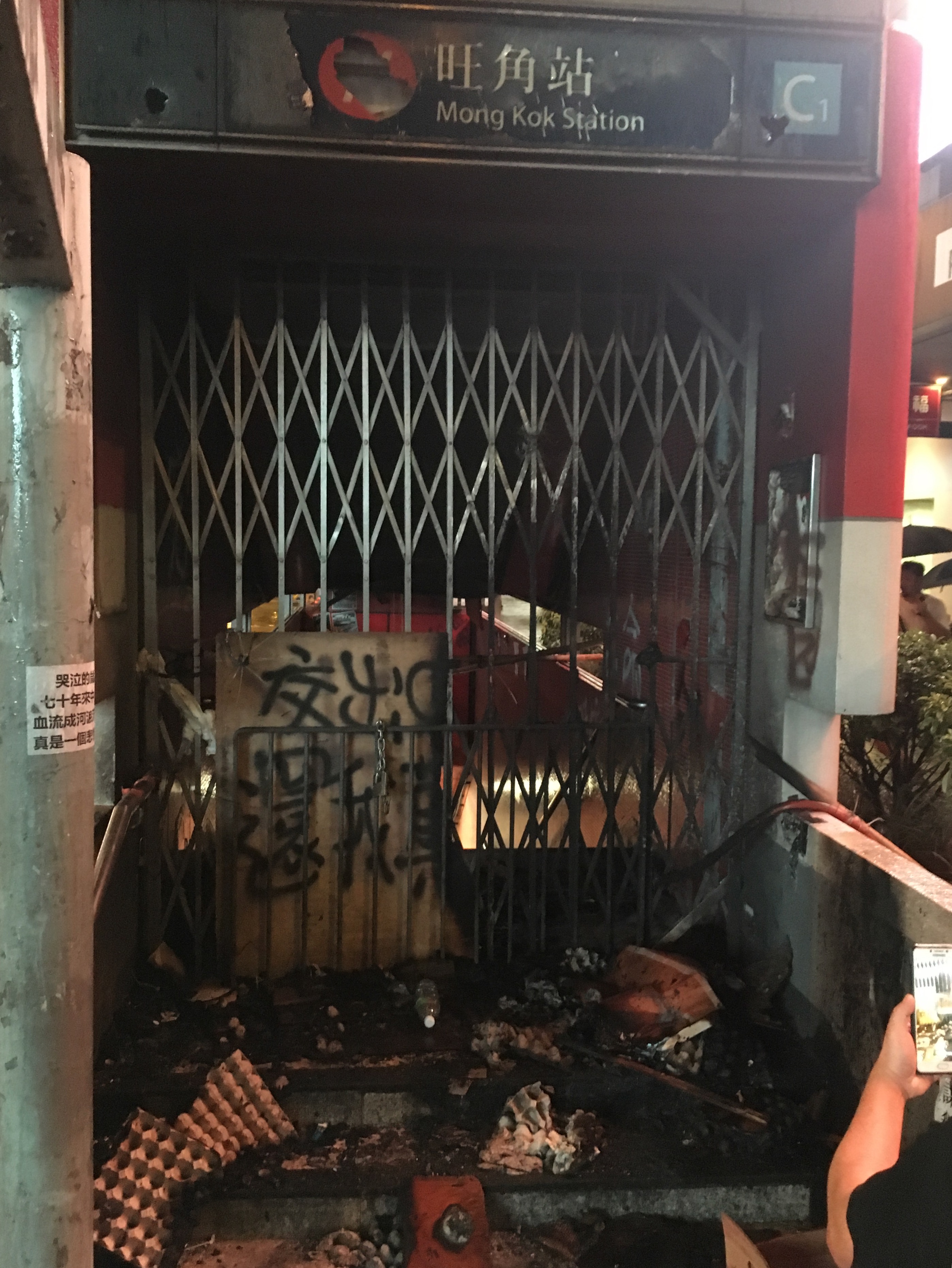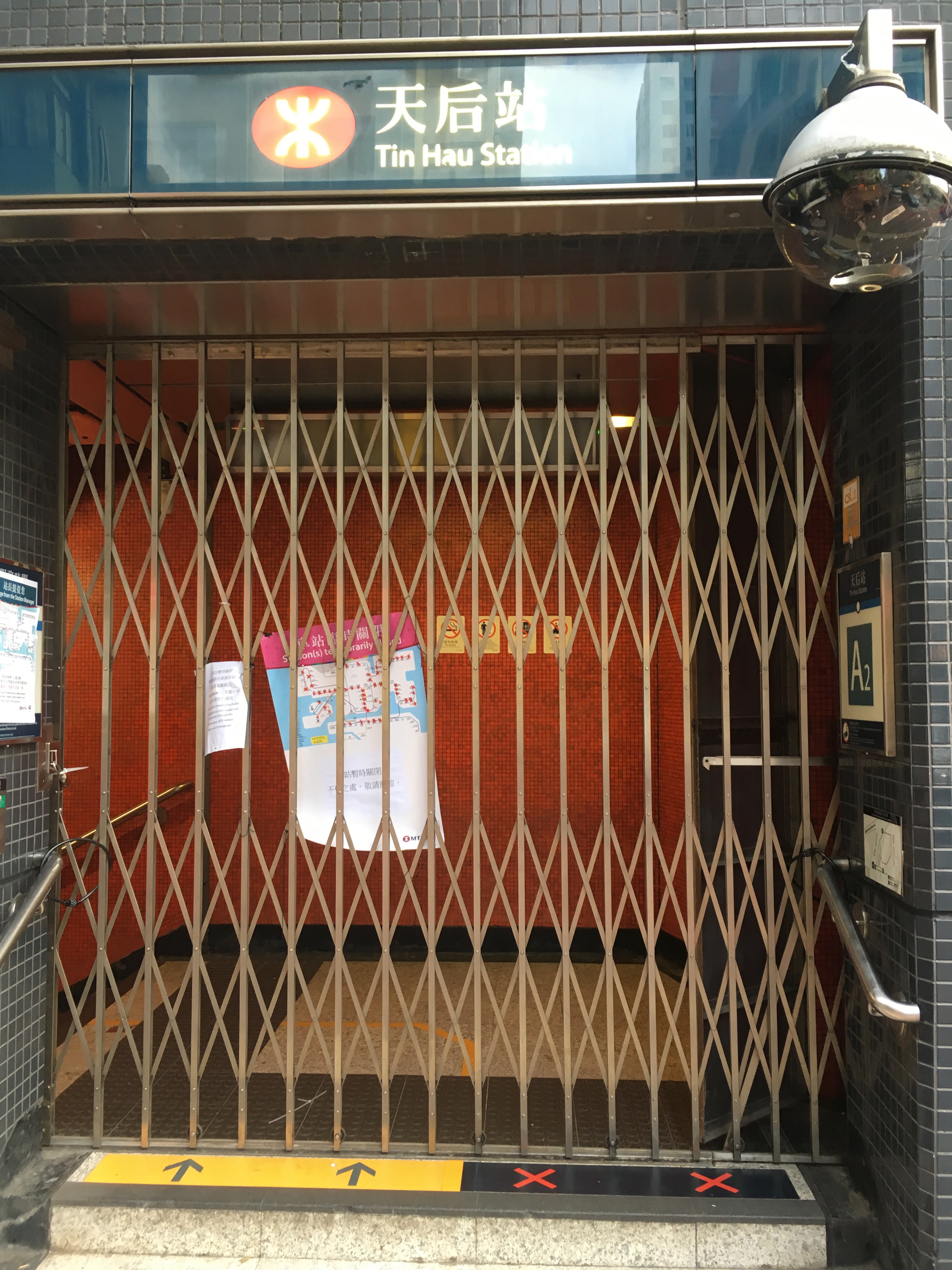 Just to note Kowloon Tong Station. It was normal now that at many stations exits were shut, and many machines covered up due to ‘ not working – vandalism.’ It was found out, that a lot of this was bullshit – by people actually trying the machines, and being able to use them, and seeing they clearly weren’t damaged underneath the fabric. Clearly this exit was damaged though!