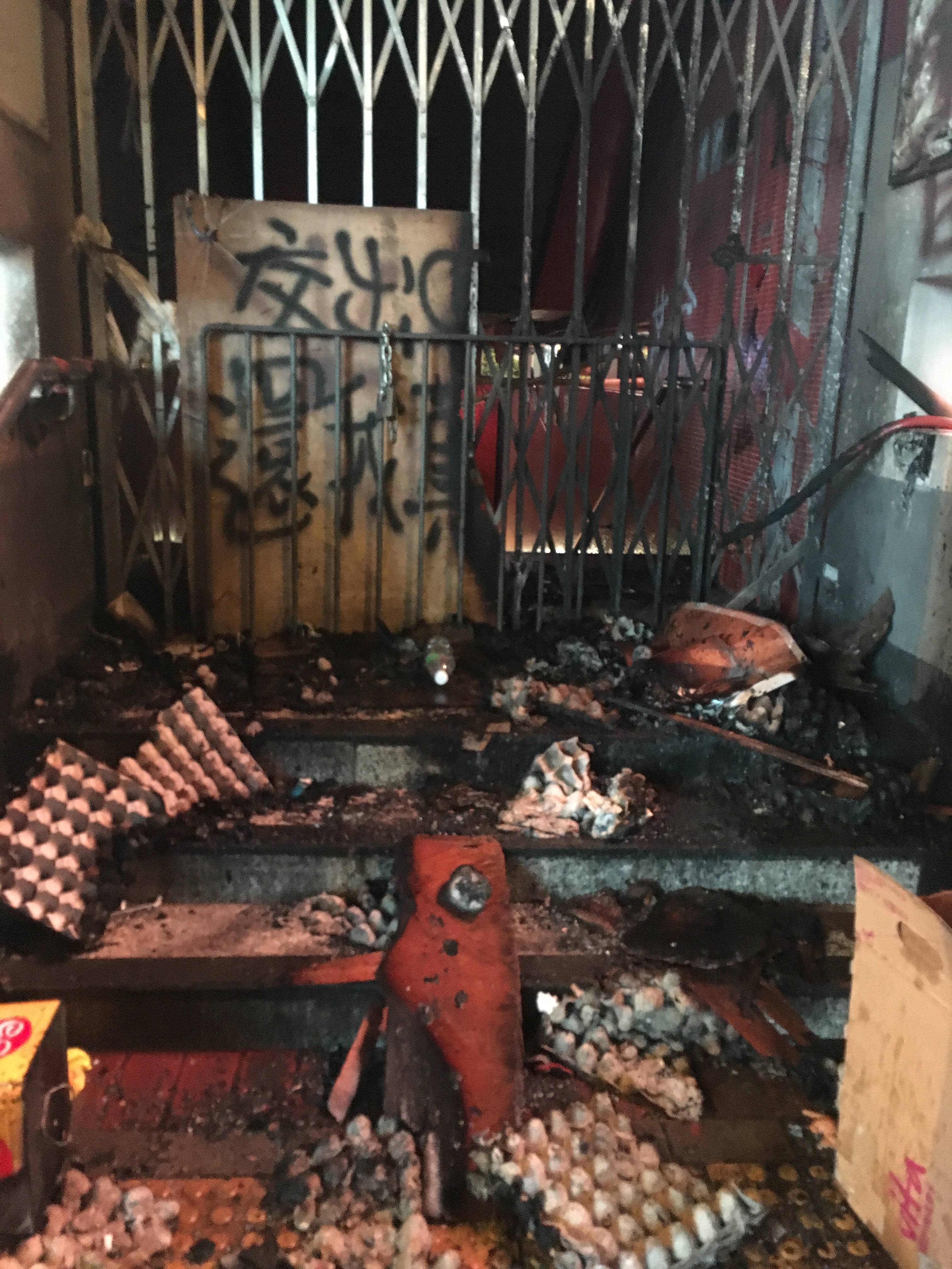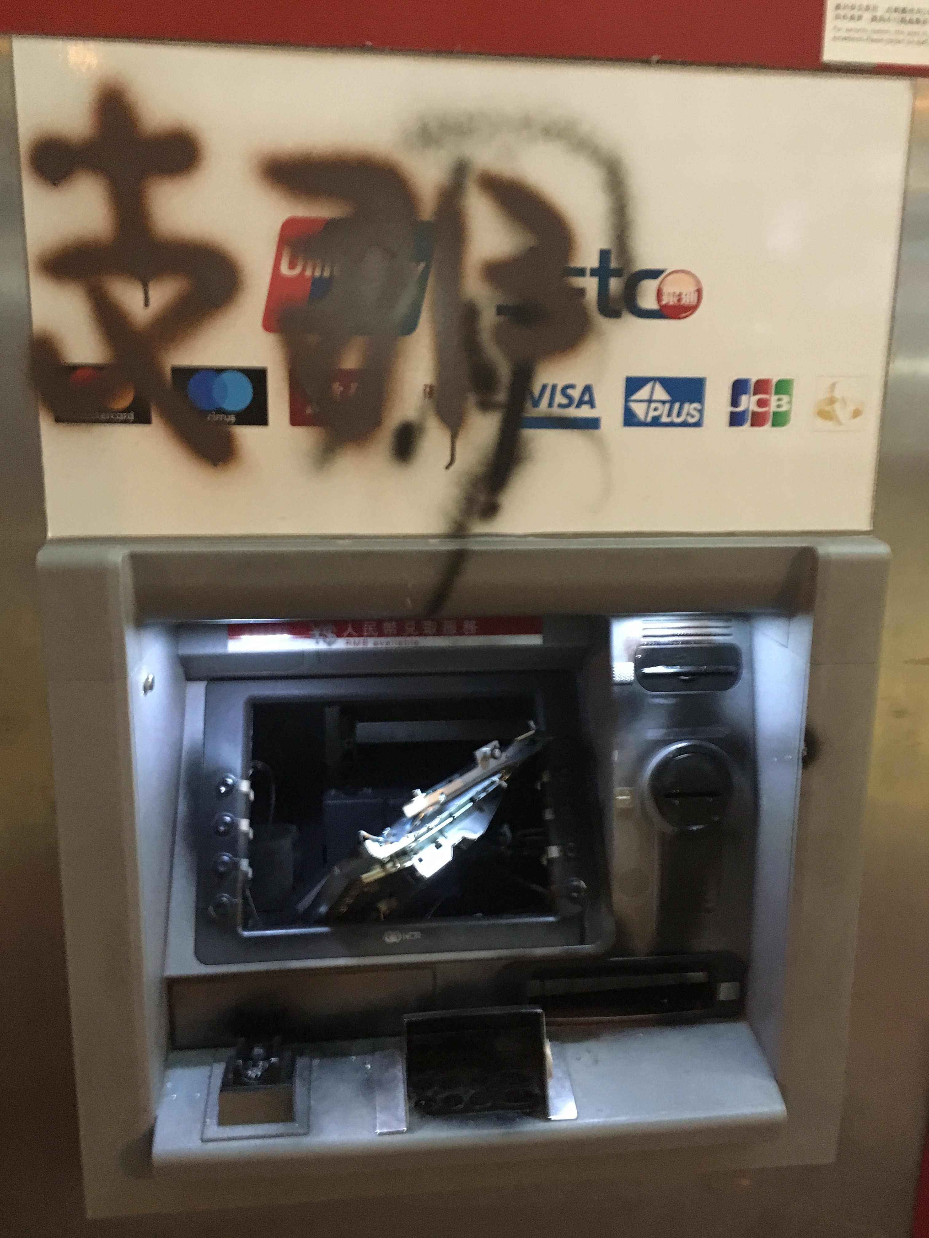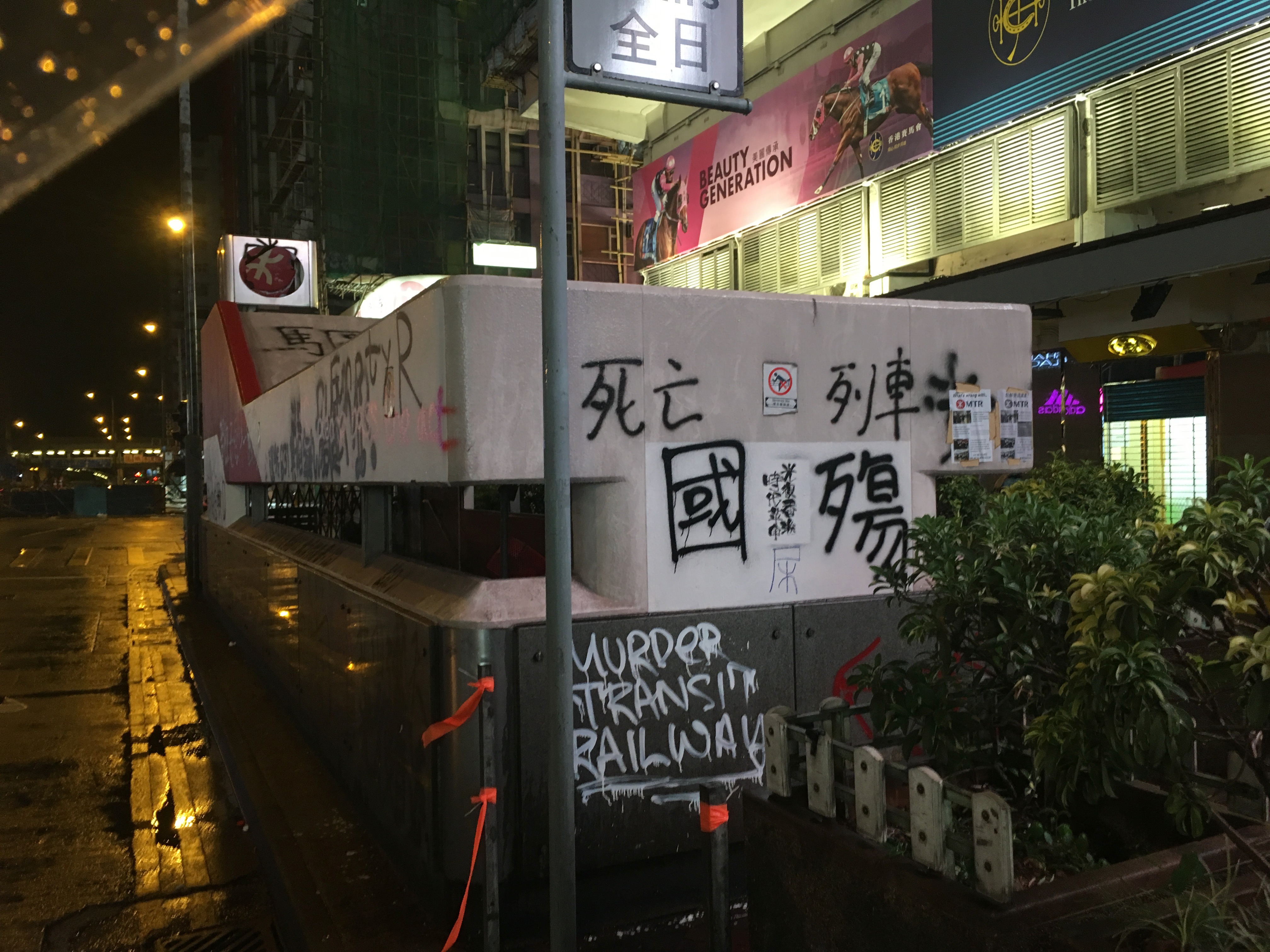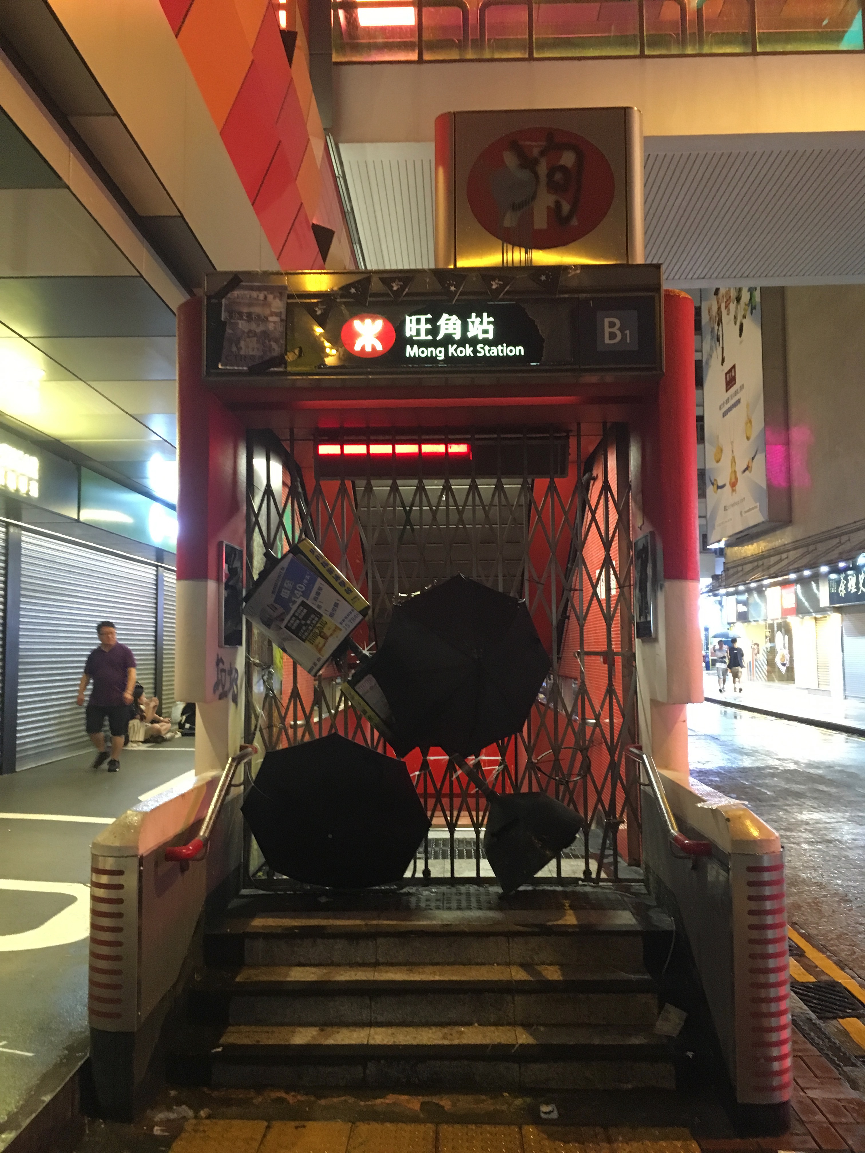 Just to note Kowloon Tong Station. It was normal now that at many stations exits were shut, and many machines covered up due to ‘ not working – vandalism.’ It was found out, that a lot of this was bullshit – by people actually trying the machines, and being able to use them, and seeing they clearly weren’t damaged underneath the fabric. Clearly this exit was damaged though!