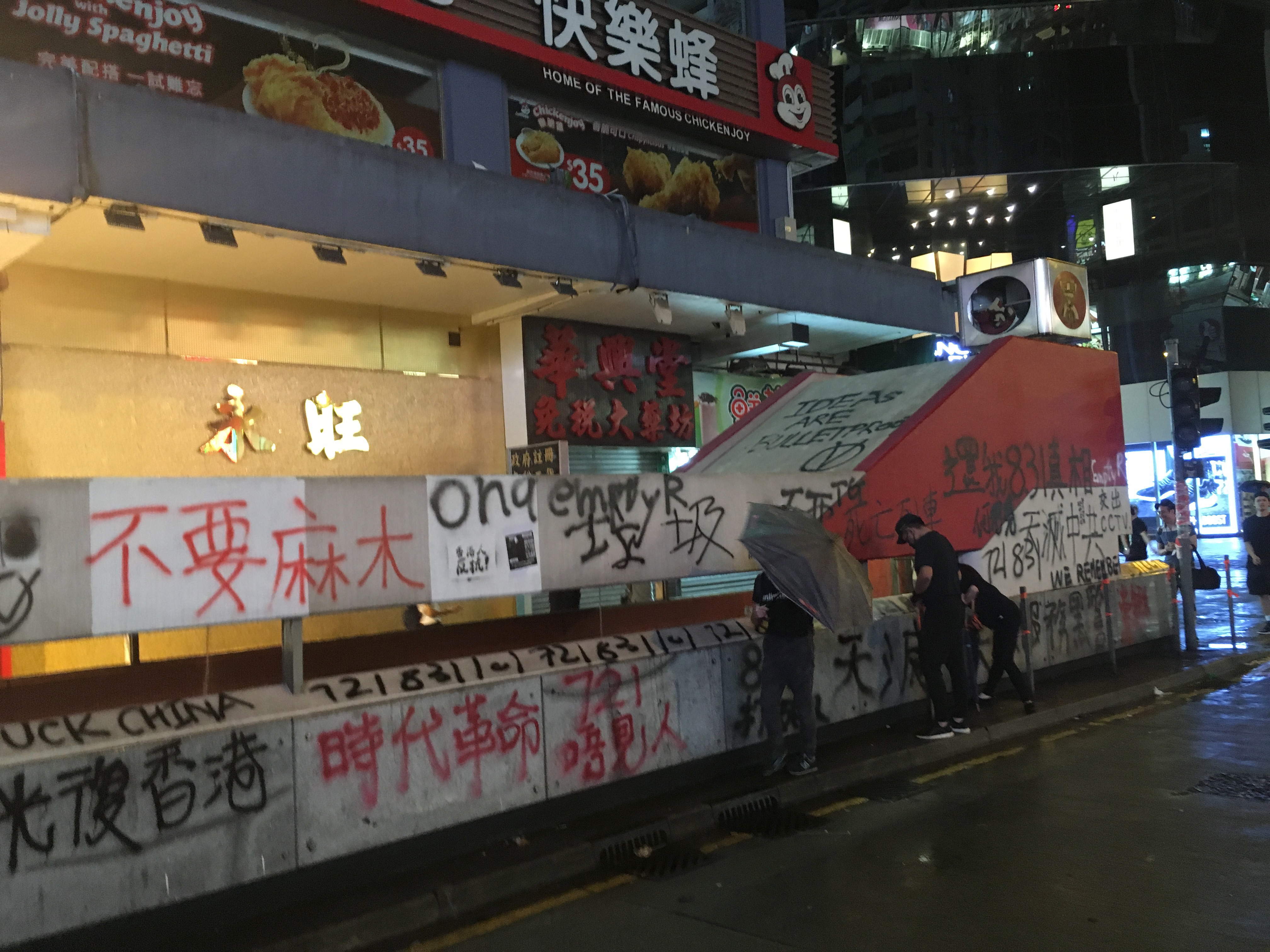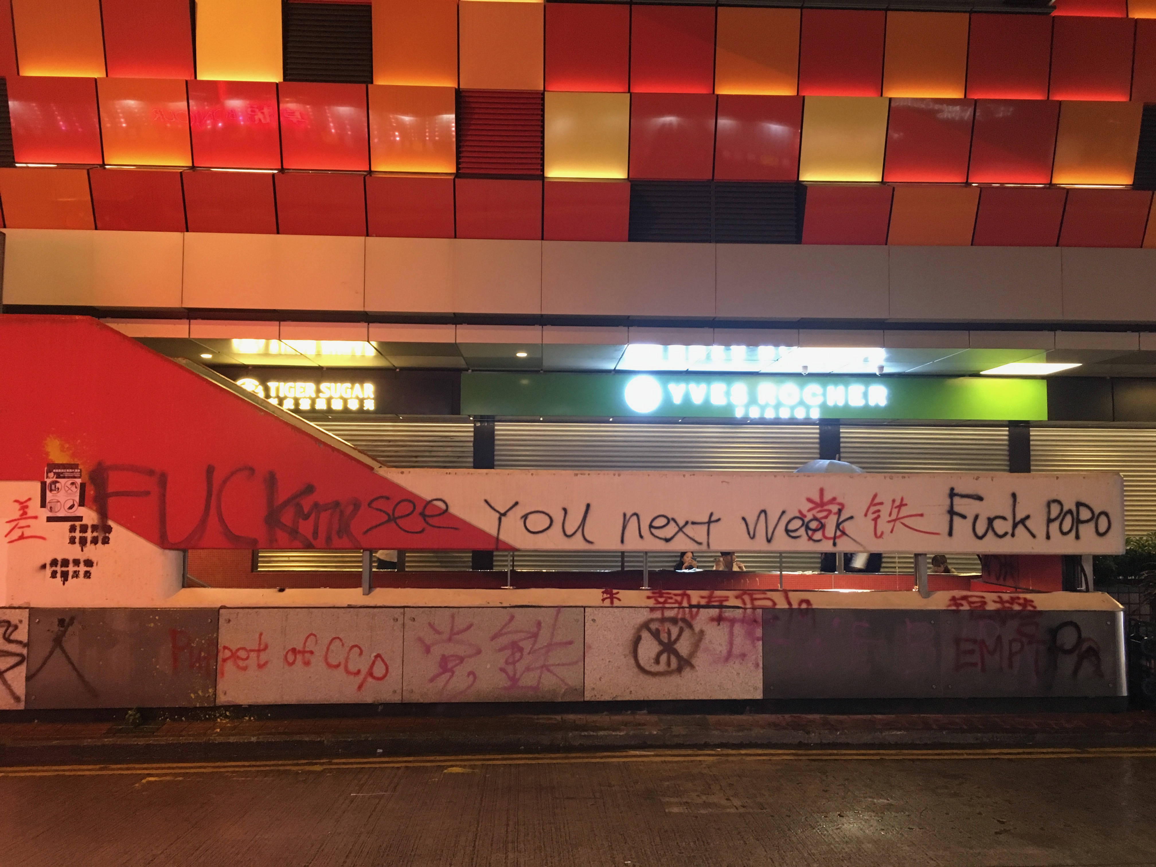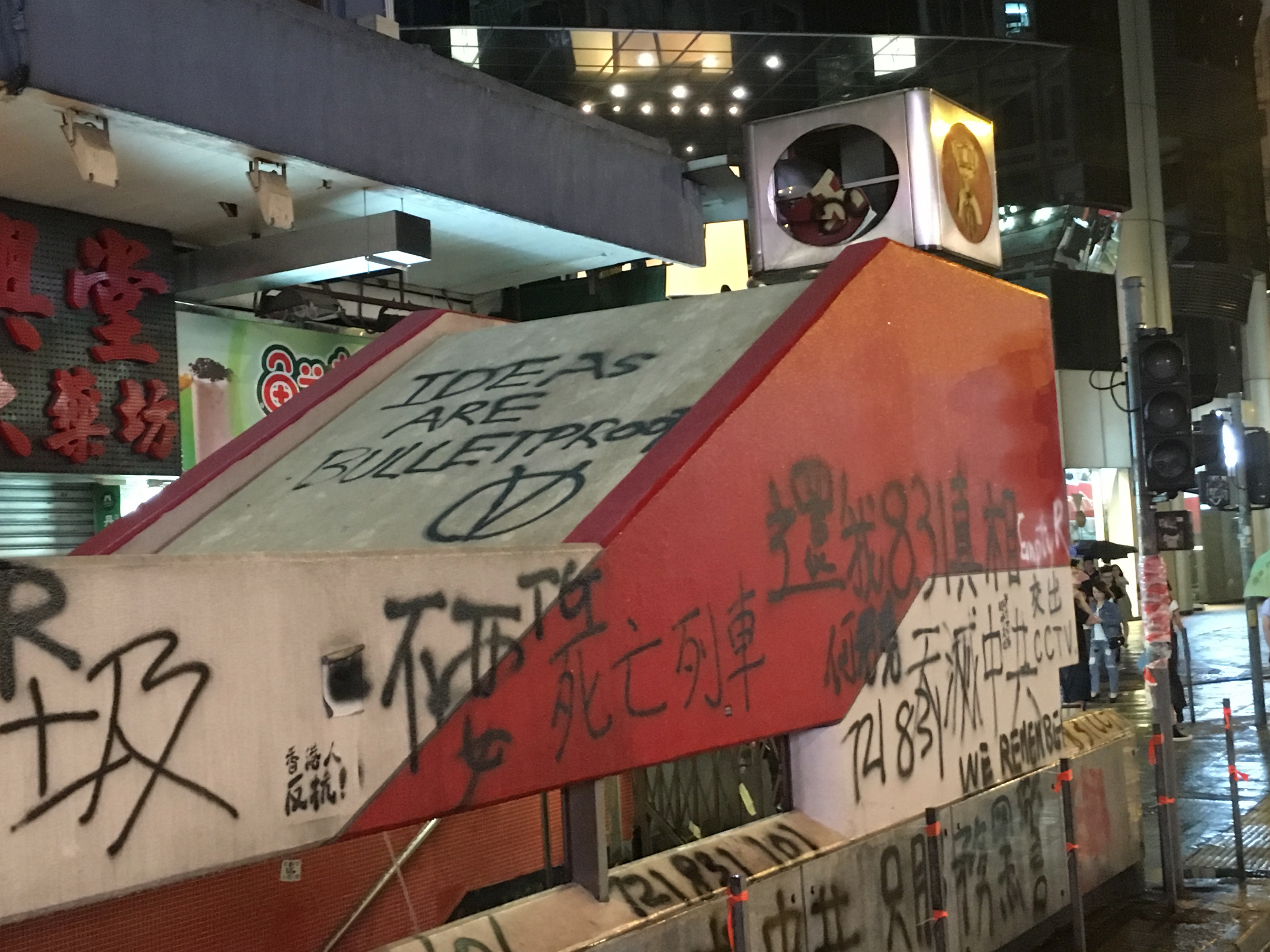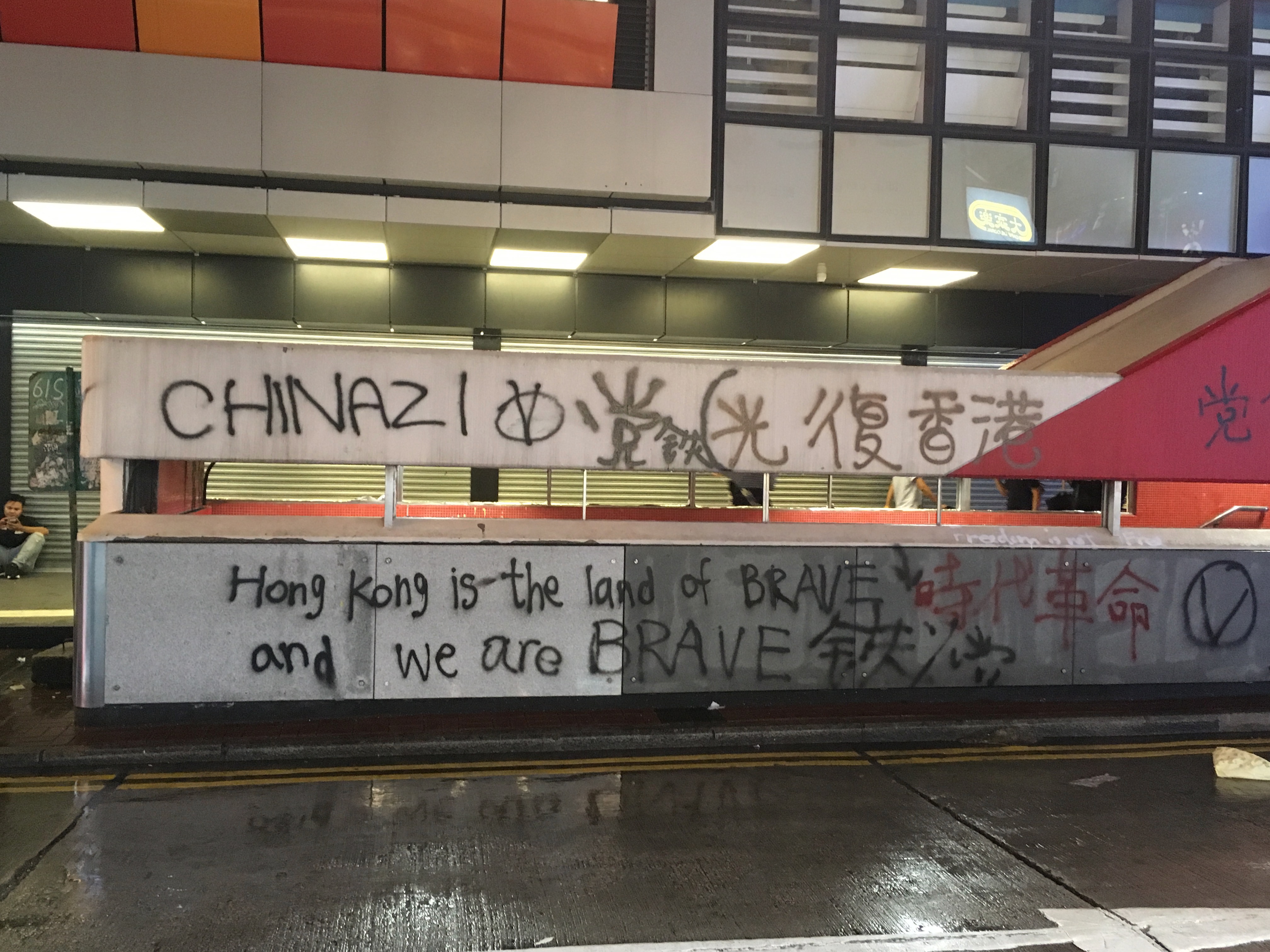 Street signs on the floor, graffitied ‘Fuck Popo,’ ‘Hong Kong is the Land of the Brave, and We Are Brave’ – ‘Ideas are Bulletproof.’ The MTR was graffited and vandalised, ‘Empty R’ – ‘Murder Transit Railway’ due to the links and cooperation with the triads and the Police force. And amongst all of this were people just going about their business.