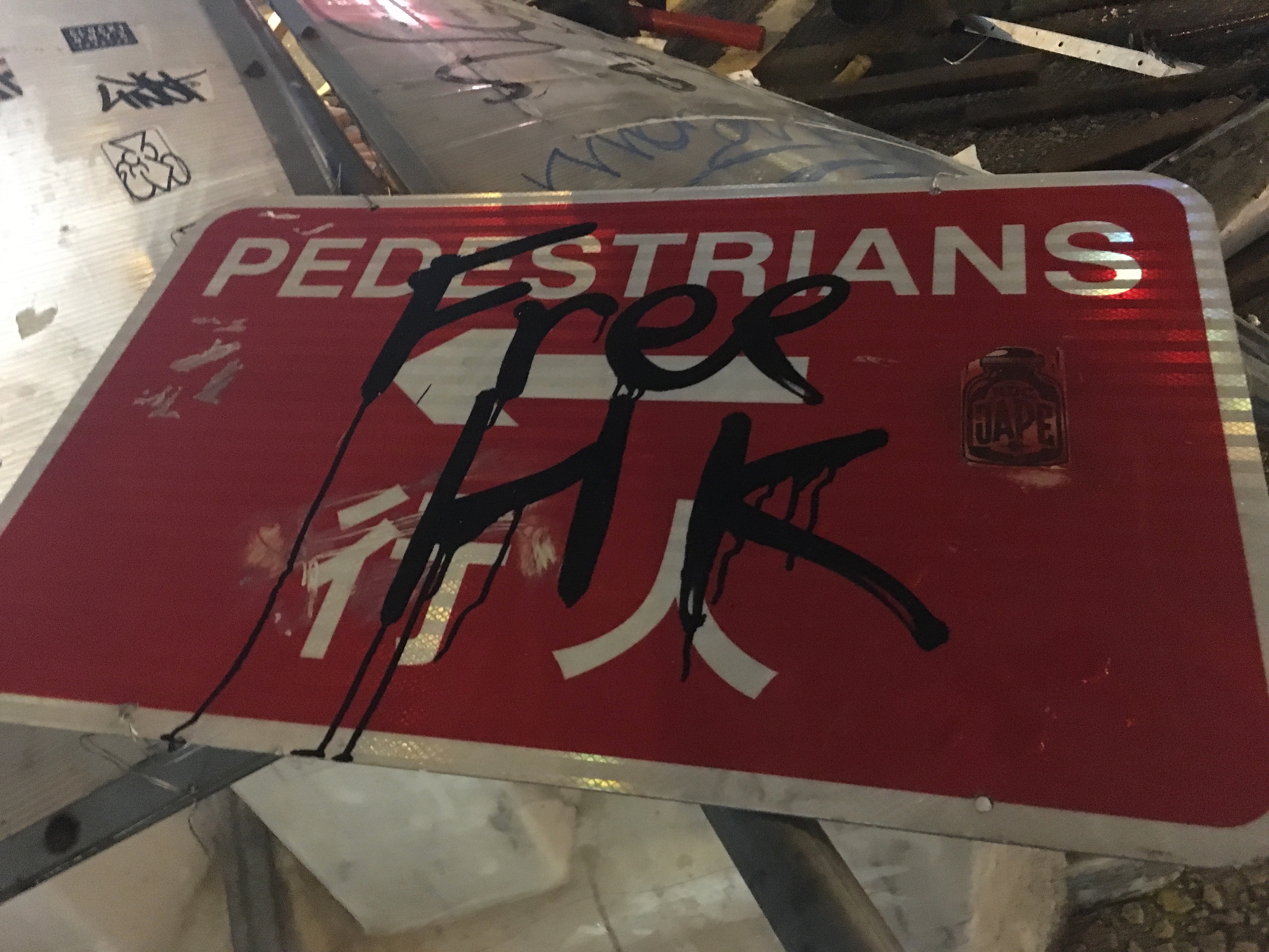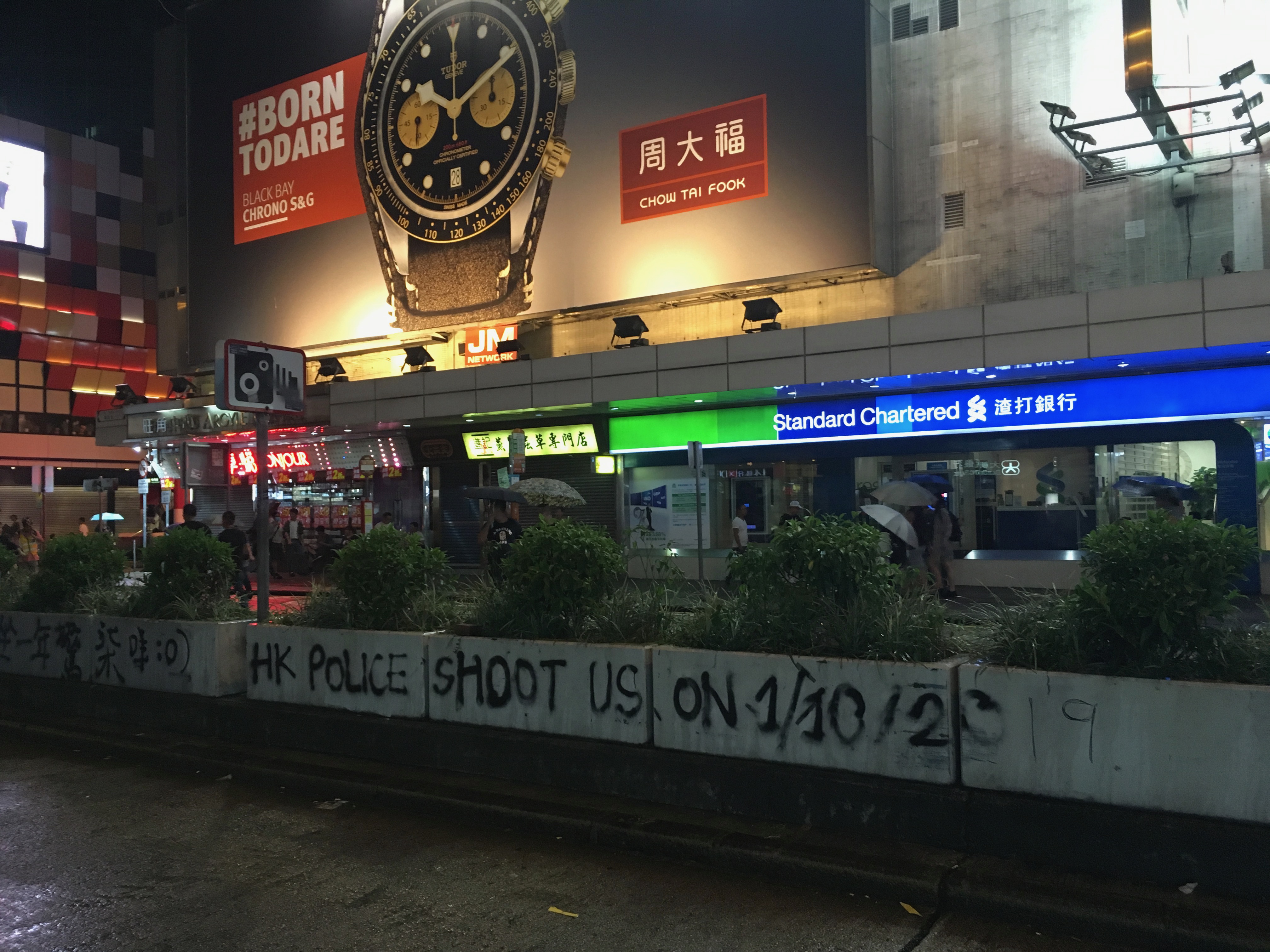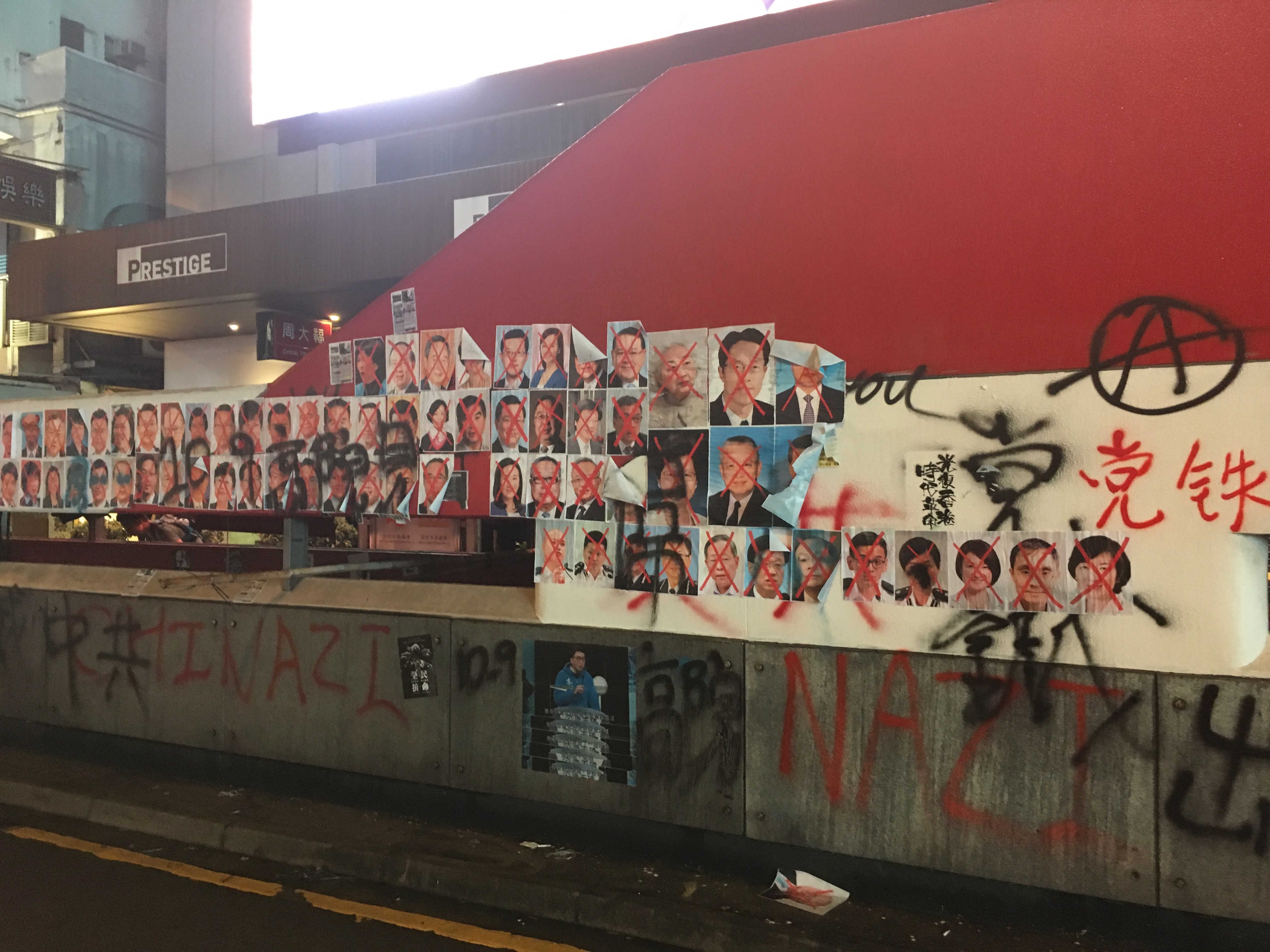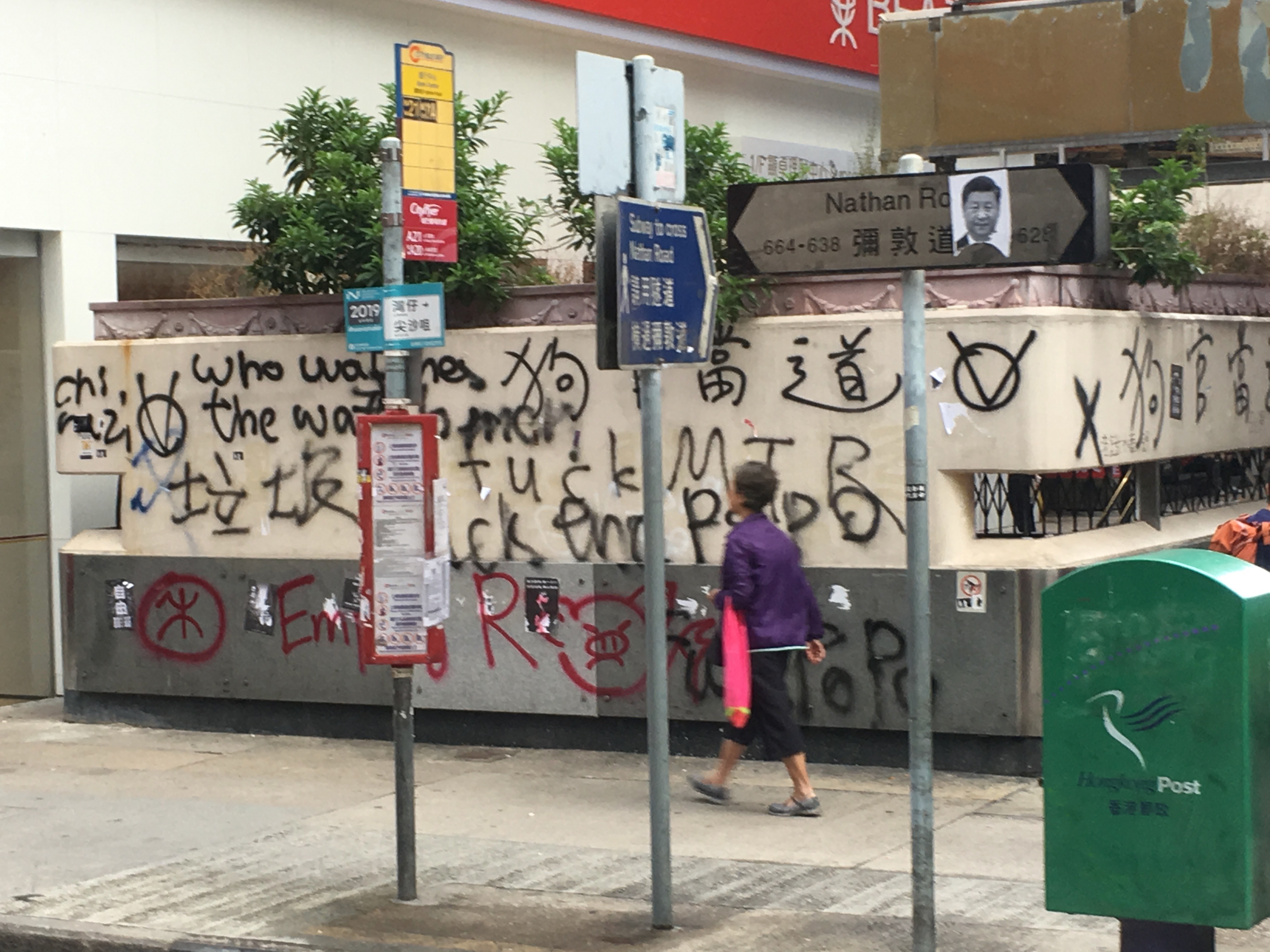 Street signs on the floor, graffitied ‘Fuck Popo,’ ‘Hong Kong is the Land of the Brave, and We Are Brave’ – ‘Ideas are Bulletproof.’ The MTR was graffited and vandalised, ‘Empty R’ – ‘Murder Transit Railway’ due to the links and cooperation with the triads and the Police force. And amongst all of this were people just going about their business.